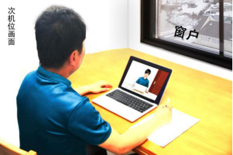 主機位為面試主機位(最好為筆記本電腦或臺式機),面向考生,用于考官對考生的遠程視頻考核。放置面試主機位的書桌應(yīng)緊貼墻面擺放,主機位攝像頭覆蓋房間門口。考試開始時考生將主機位攝像頭環(huán)繞360度,使面試人員查看考場全部場景??忌救苏龑υO(shè)備攝像頭,保持坐姿端正,面部、上半身及雙手在畫面中清晰可見。示意圖如下: