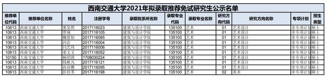 西南交通大學建筑與設計學院2021年碩士推免生錄取名單 發(fā)布時間:2020-10-26 西南交通大學建筑與設計學院2021年碩士推免生錄取名單 上一篇:西南交通大學建筑與設計學院2021年考研招生目錄及參考書目 下一篇:西南交通大學2021年考研復試線公布(設計學、藝術設計、機械)