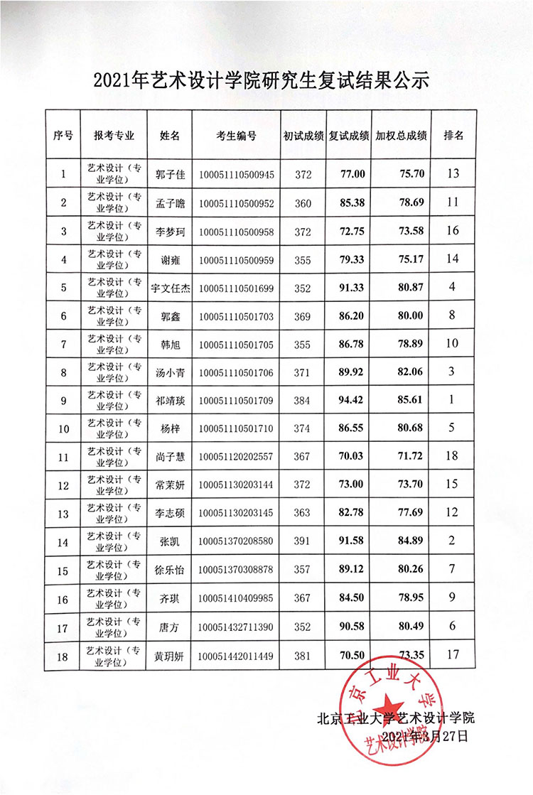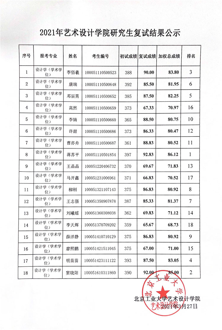 北京工業(yè)大學(xué)藝術(shù)設(shè)計(jì)學(xué)院2021年考研復(fù)試結(jié)果公示