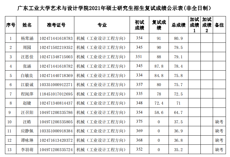 廣東工業(yè)大學藝術(shù)設(shè)計學院2021年考研復試結(jié)果公示(機械碩士-工業(yè)設(shè)計工程)