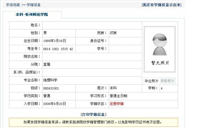 2、所有考生的資格審核以錄取結(jié)果上報(bào)教育部后的審核結(jié)果為準(zhǔn)。若考生在學(xué)信網(wǎng)無(wú)法查詢到本人信息(見(jiàn)附圖2)或?qū)W信網(wǎng)備案信息與報(bào)考信息不符(均會(huì)造成教育部錄取審核無(wú)法通過(guò),無(wú)法錄?。?qǐng)立即與本科院校相關(guān)部門聯(lián)系以盡快更正或按以下辦法進(jìn)行學(xué)籍學(xué)歷認(rèn)證: