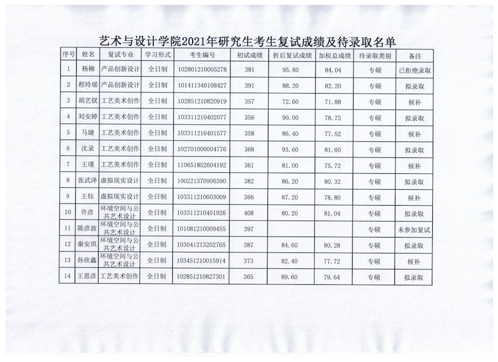 南昌航空大學(xué)藝術(shù)設(shè)計(jì)學(xué)院2021年考研調(diào)劑錄取名單 發(fā)布時(shí)間:2021-03-30 南昌航空大學(xué)藝術(shù)設(shè)計(jì)學(xué)院2021年考研調(diào)劑錄取名單 上一篇:南昌航空大學(xué)藝術(shù)設(shè)計(jì)學(xué)院2021年考研復(fù)試成績(jī)及待錄取名單 下一篇:南昌航空大學(xué)藝術(shù)與設(shè)計(jì)學(xué)院2022年考研招生目錄