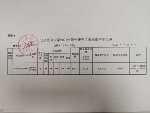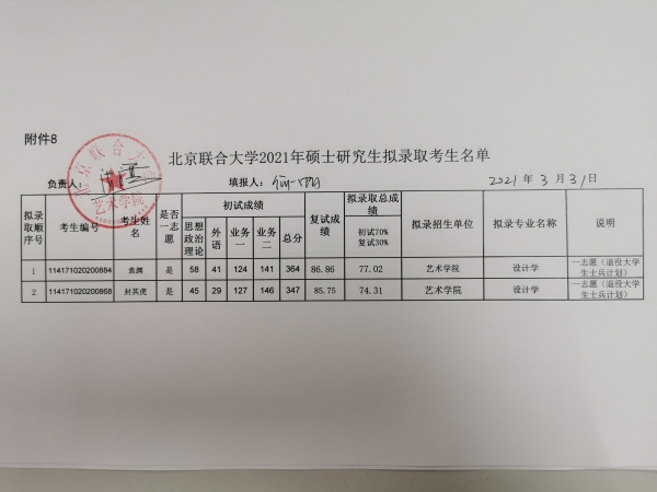 北京聯(lián)合大學藝術(shù)學院2021年考研錄取名單 發(fā)布時間:2021-03-01 上一篇:北京聯(lián)合大學藝術(shù)學院2022年保研錄取名單 下一篇:2021年北京聯(lián)合大學設(shè)計學一級學科碩士研究生復試通知