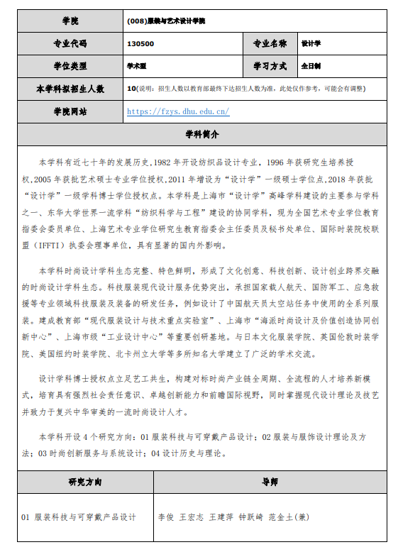 東華大學(xué)服裝與藝術(shù)設(shè)計學(xué)院2022年博士研究生招生目錄 發(fā)布時間:2021-11-30 東華大學(xué)服裝與藝術(shù)設(shè)計學(xué)院2022年博士研究生招生目錄 上一篇:東華大學(xué)2022年考研成績查詢及復(fù)核通知 下一篇:東華大學(xué)2022年考研復(fù)試分?jǐn)?shù)線(工業(yè)設(shè)計工程)