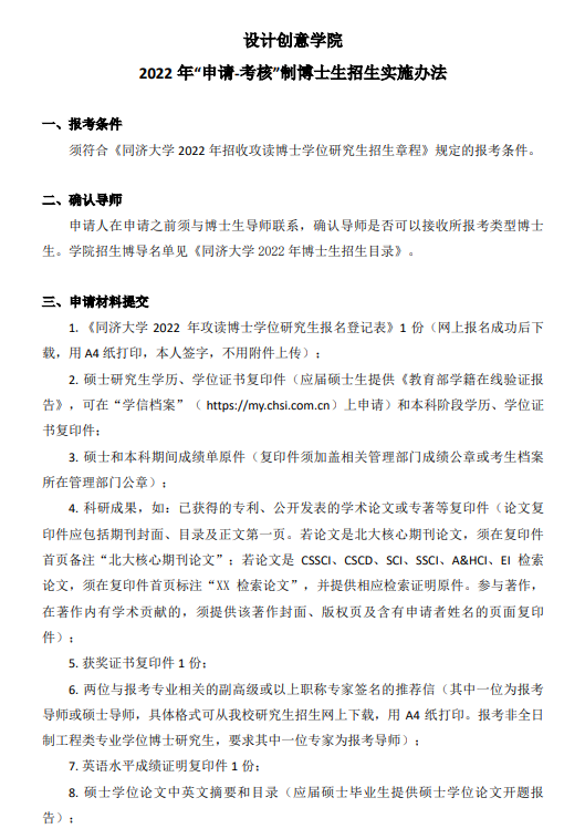 同濟大學(xué)設(shè)計創(chuàng)意學(xué)院2022年博士研究生“申請-考核”制招生實施辦法