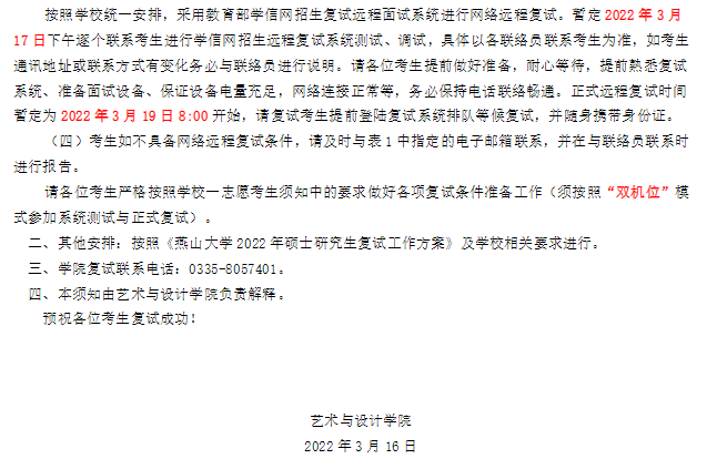 藝術(shù)與設(shè)計學(xué)院2022年考研碩士研究生一志愿復(fù)試考生須知 發(fā)布時間:2022-03-17 藝術(shù)與設(shè)計學(xué)院2022年考研碩士研究生一志愿復(fù)試考生須知 上一篇:燕山大學(xué)2022年考研復(fù)試工作方案 下一篇:燕山大學(xué)2022年考研一志愿復(fù)試名單公布