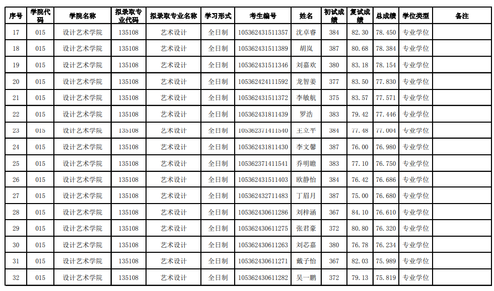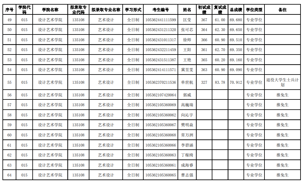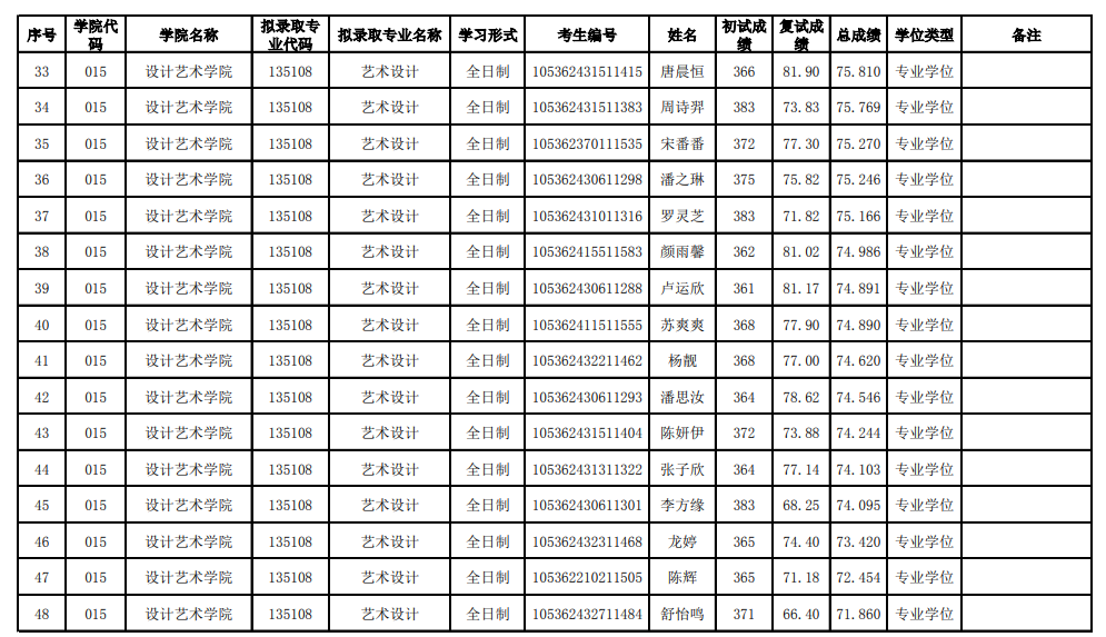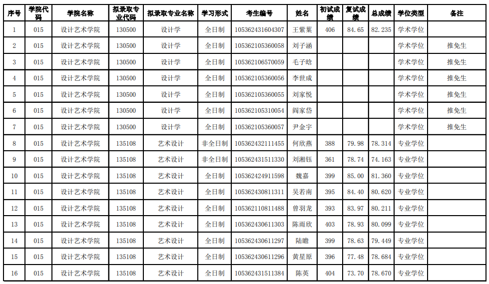 長沙理工大學(xué)設(shè)計(jì)藝術(shù)學(xué)院2022年考研(一志愿)擬錄取名單公示 發(fā)布時間:2022-03-31 長沙理工大學(xué)設(shè)計(jì)藝術(shù)學(xué)院2022年考研(一志愿)擬錄取名單公示 上一篇:長沙理工大學(xué)設(shè)計(jì)藝術(shù)學(xué)院2022年考研復(fù)試工作實(shí)施方案 下一篇:長沙理工大學(xué)設(shè)計(jì)藝術(shù)學(xué)院2024年考研招生目錄