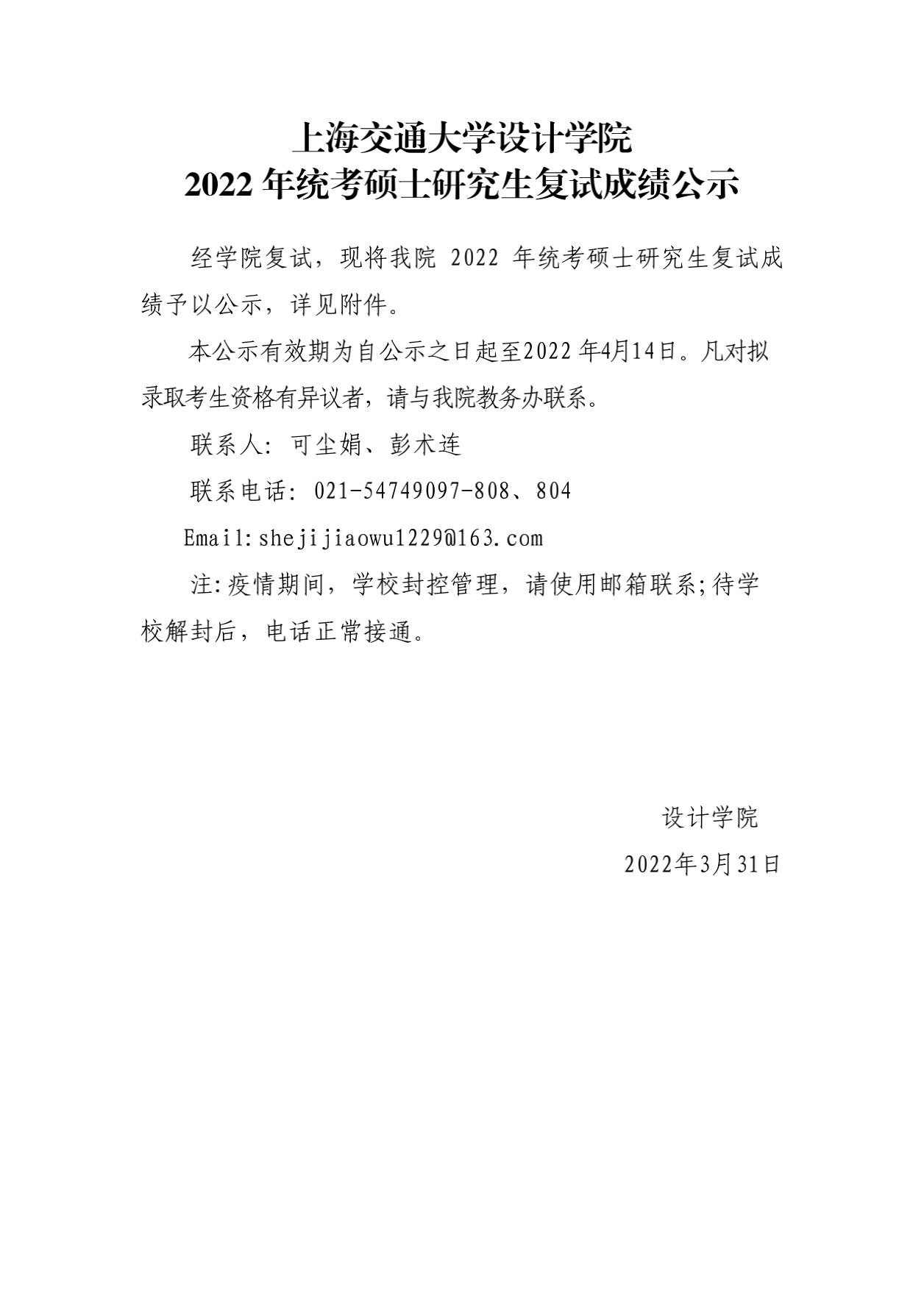 ?上海交通大學設計學院2022年考研復試成績公示 發(fā)布時間:2022-03-31 上海交通大學設計學院2022年考研復試成績公示 上一篇:上海交通大學2022年考研復試工作方案 下一篇:上海交通大學設計學院2023年考研招生目錄
