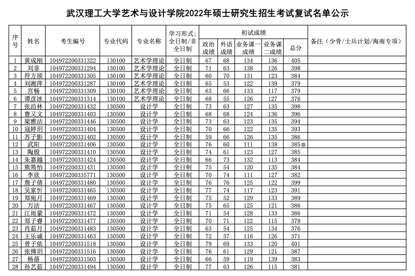 武漢理工大學(xué)藝術(shù)與設(shè)計(jì)學(xué)院2022年考研復(fù)試名單公示(一志愿)