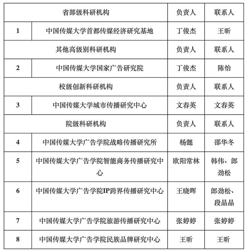 學(xué)院主要科研機(jī)構(gòu)包括國(guó)家廣告研究院(國(guó)家工商行政管理總局批準(zhǔn)設(shè)立)、中國(guó)廣告博物館、全國(guó)公益廣告創(chuàng)新研究基地、首都傳媒經(jīng)濟(jì)研究基地(入選CTTI國(guó)家智庫(kù)序列)等。