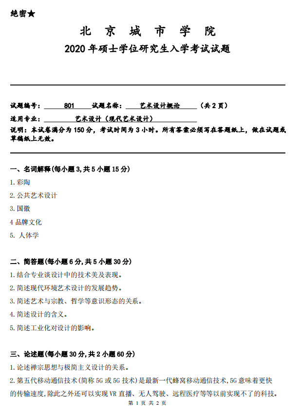 北京城市學院2020年藝術(shù)設計考研真題:801藝術(shù)設計概論 發(fā)布時間:2020-09-21 上一篇:北京城市學院2020年藝術(shù)設計考研真題:336藝術(shù)基礎 下一篇:北京城市學院2020年藝術(shù)設計考研真題:808中國工藝美術(shù)史