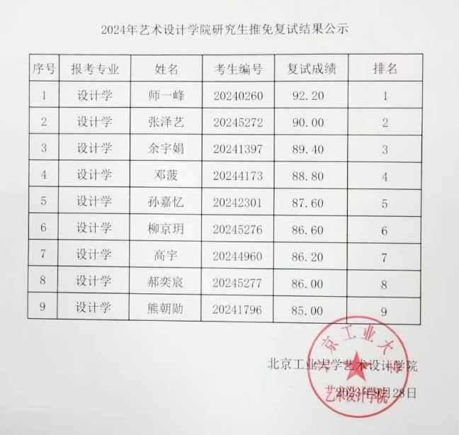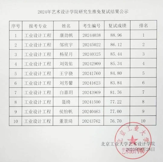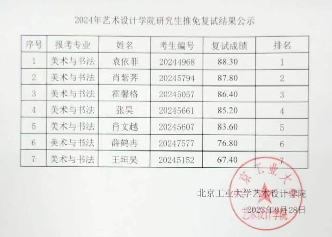 北京工業(yè)大學(xué)藝術(shù)設(shè)計(jì)學(xué)院2024年保研復(fù)試結(jié)果公示