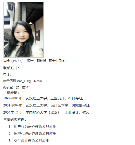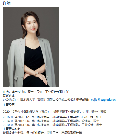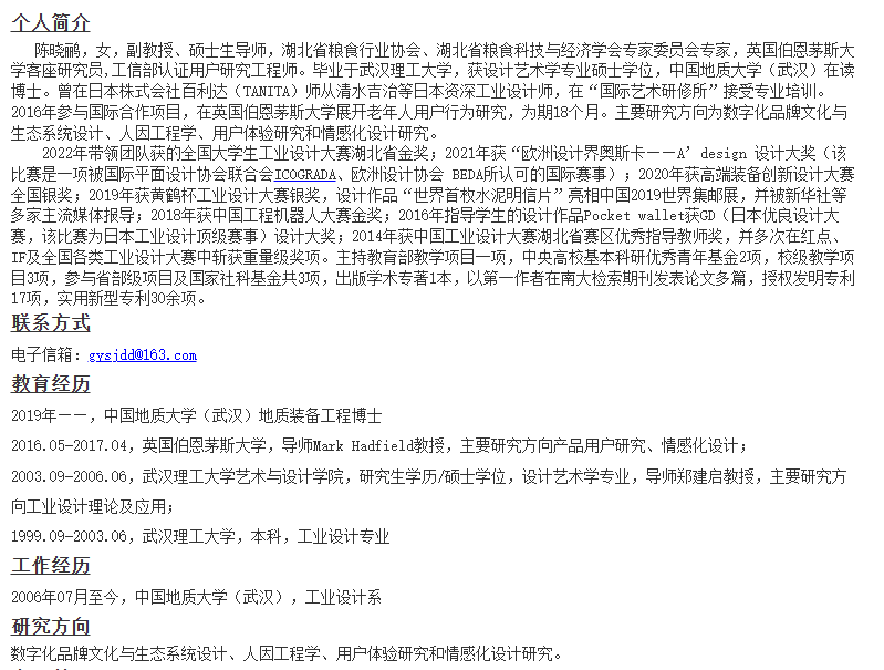 中國地質(zhì)大學(武漢)工業(yè)設計導師簡介 發(fā)布時間:2024-09-01 中國地質(zhì)大學(武漢)工業(yè)設計導師簡介 上一篇:中國地質(zhì)大學(武漢)機械與電子信息學院 2025年設計學保研招生人數(shù) 下一篇:中國地質(zhì)大學(武漢)藝術與傳媒學院2025年保研面試成績公示