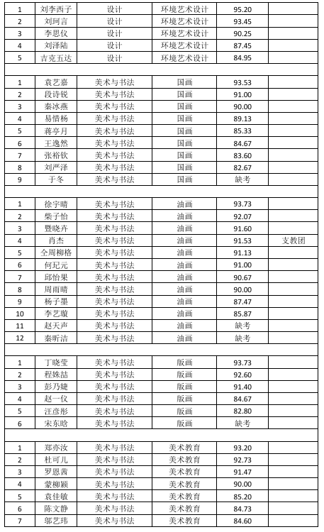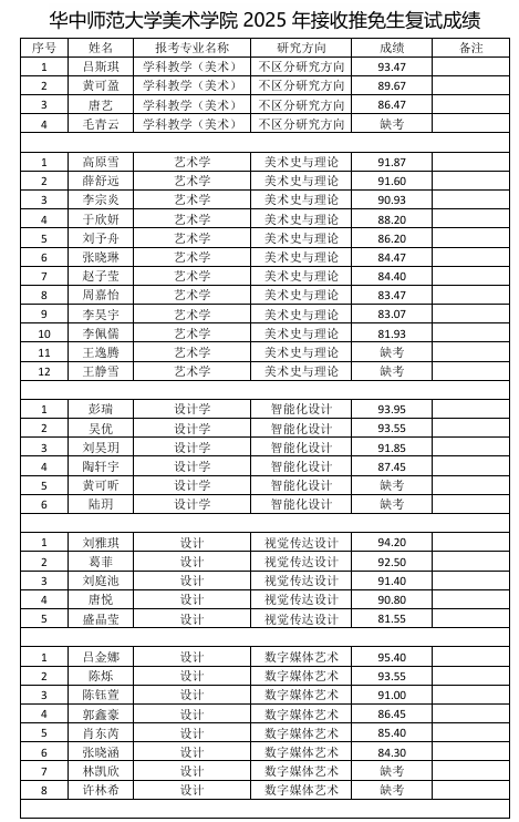 華中師范大學(xué)美術(shù)學(xué)院2025年接收推免生復(fù)試成績(jī)公示 發(fā)布時(shí)間:2024-09-26 華中師范大學(xué)美術(shù)學(xué)院2025年接收推免生復(fù)試成績(jī)公示 上一篇:華中師范大學(xué)美術(shù)學(xué)院2024年優(yōu)秀大學(xué)生暑期夏令營(yíng)初審合格名單 下一篇:華中師范大學(xué)美術(shù)學(xué)院2025年考研招生目錄及招生人數(shù)